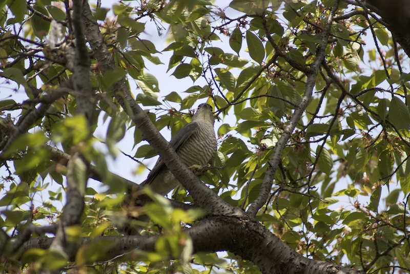 サクラの木に止まるツミ、自宅近くの林に営巣しているようです。今年も出会えました。